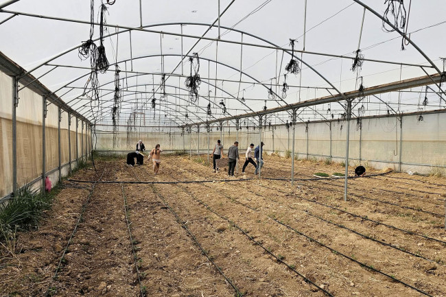 Membres de la cooperativa Land and Farming de Burin treballant dins l'hivernacle en una àrea sota control israelià Foto: Land and Farming