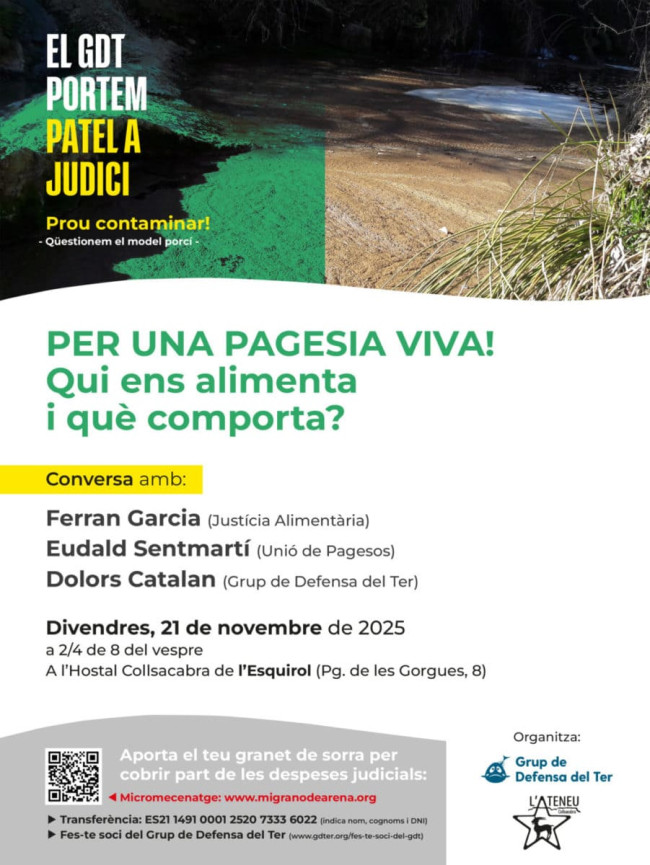 A l'acte, que es farà a 2/4 de 8 del vespre a l'Hostal Collsacabra, hi participaran Ferran Garcia, de Justícia Alimentària; Eudald Sentmartí, de la Unió de Pagesos, i Dolors Catalan, del Grup de Defensa del Ter.