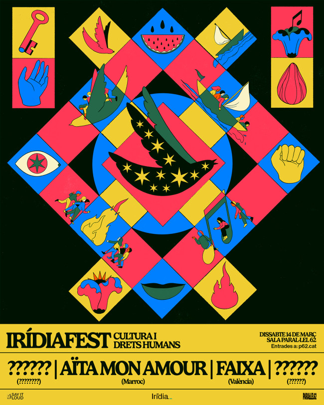 Són precisament aquests conceptes de diversitat, resistència i unió els que han inspirat a la il·lustradora barcelonina Cristina Daura per dissenyar el cartell de la quarta edició. Una imatge que, a través d’un mosaic de formes i colors vibrants, apel·la a la força col·lectiva, a la solidaritat i al moviment compartit. «Cada casella representa una veu, una lluita, una esperança que conflueix en un centre comú. Una metàfora visual d’un teixit viu com és l’IrídiaFest», ha explicat l’autora.