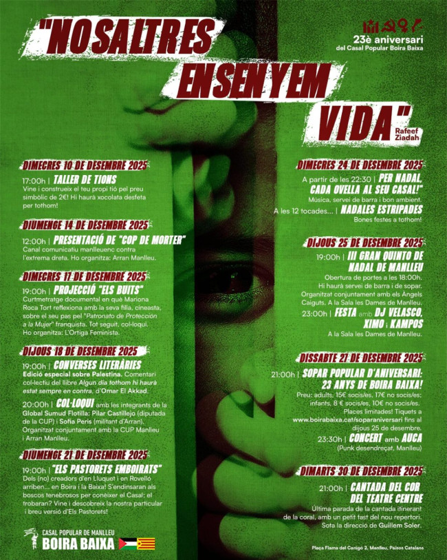 El tret de sortida a la programació tindrà lloc dimecres 10 de desembre a la tarda, amb el ja consolidat taller de tions. L’activitat, oberta a tothom i adreçada especialment a la canalla, permetrà a les persones assistents construir el seu propi tió per un preu simbòlic de 2 euros. A més, hi haurà xocolata desfeta per tothom. Diumenge 14 al migdia, acolliran al casal popular la presentació de la iniciativa «Cop de morter», un canal comunicatiu impulsat per Arran Manlleu que té per objectiu desmuntar mites de l’extrema dreta i enfortir la cohesió social i el sentiment de pertinença a Manlleu.