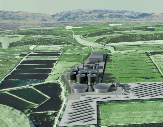 Recreació de com quedaria la macroplanta de biogàs, entre sòl agrari protegit i la serra de Bellmunt-Almenara, inclosa dins la Xarxa Natura 2000 Foto: Pobles Vius