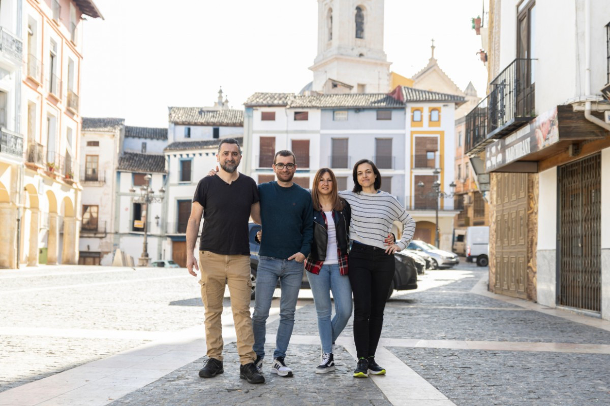 L'equip de la cooperativa a la Plaça del Mercat de Xàtiva, ben a prop de la seva seu. Foto: Ulisses Ortiz