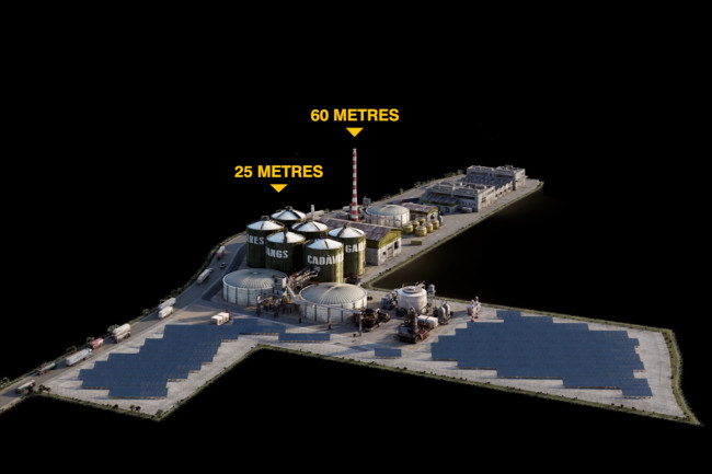 Recreació digital elaborada per la plataforma Pobles Vius, detallant l’impacte volumètric que tindrà la planta de biogàs sobre el municipi de la Sentiu de Sió