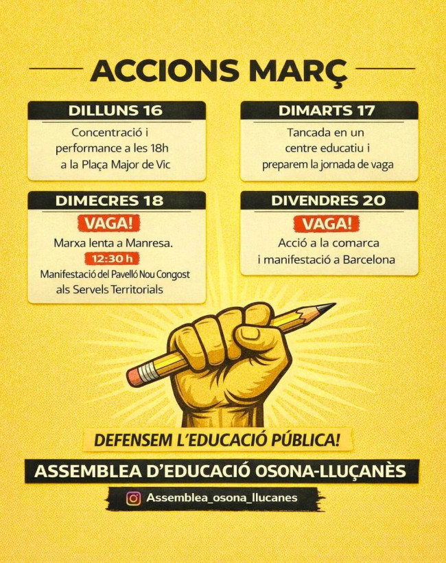 El dimecres 18 hi haurà una marxa lenta fins a Manresa, on es participarà en la manifestació que anirà del Pavelló Nou Congost fins als Serveis Territorials d'Educació a la Catalunya Central. L'hora prevista d'arribada és a les 12 del migdia. Finalment, el divendres dia 20 es farà una acció a la comarca i es participarà de la manifestació convocada a Barcelona.
